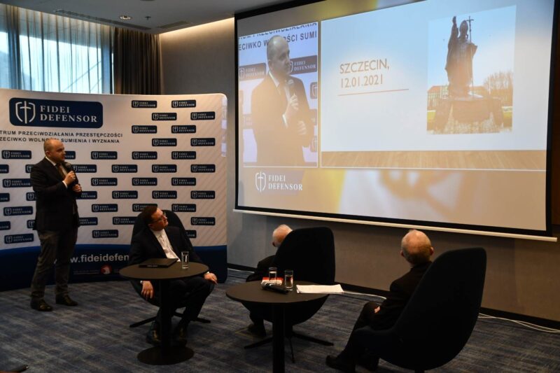 Konferencję poprowadził Adam Surmacz, prezes Fidei Defensor. Jako pierwszy zabrał głos Dariusz Matecki, lider Solidarnej Polski na Pomorzu Zachodnim. Szczeciński radny opowiedział o aktach chrystianofobii, które miały miejsce na przestrzeni ostatnich lat. Matecki podał liczne przykłady niszczenia pomników papieża Polaka, zarówno te starsze, jak również akty wandalizmu jakich mieliśmy okazję doświadczać w ostatnich dniach.