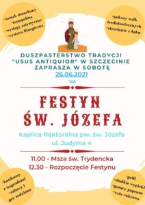 Duszpasterstwo Tradycji „Usus Antiquior” w Szczecinie zaprasza 26.06 na festyn św. Józefa, który odbędzie się przy Kaplicy Rektoralnej pw. Św. Józefa przy ul. Judyma 4. Uroczystość rozpocznie się od Mszy św. o godz. 11.00, a od 12.30 zapraszamy na piknik z wieloma atrakcjami dla przybyłych gości.