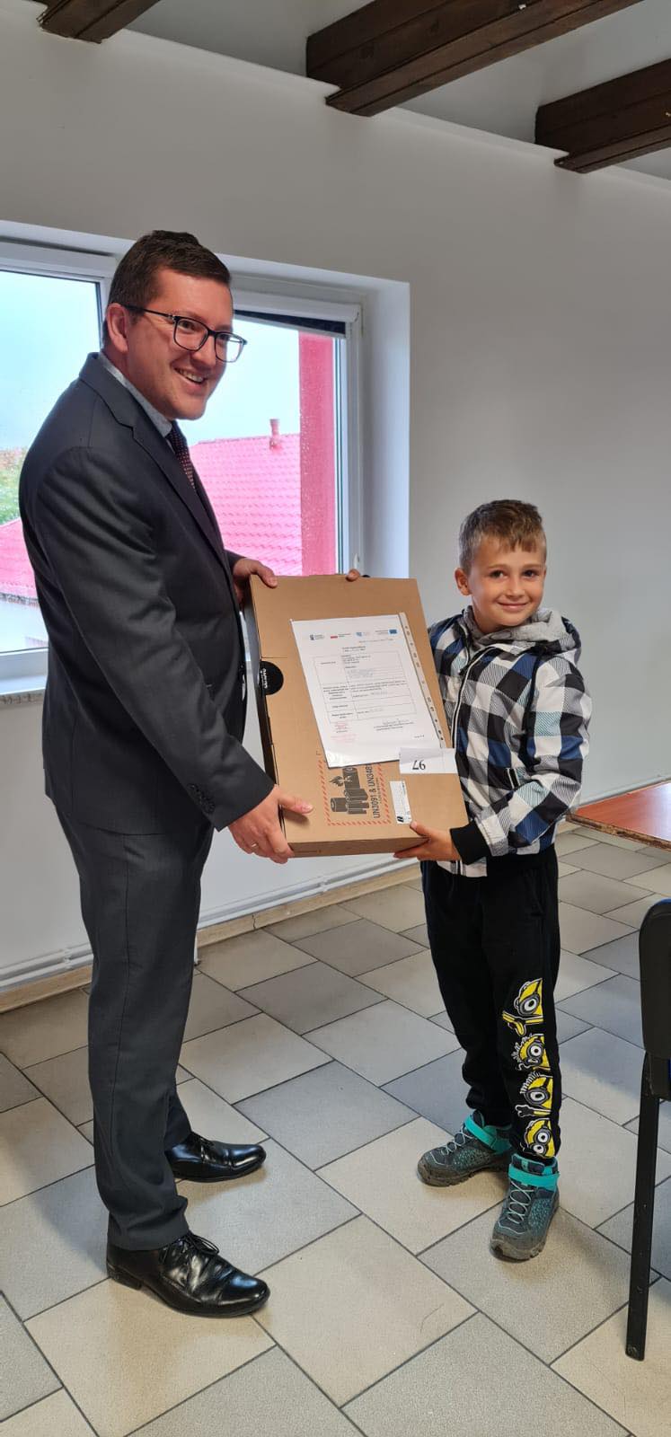 W dniu dzisiejszym wicewojewoda zachodniopomorski Mateusz Wagemann wraz z Sylwią Halamą pełniącą obowiązki wójta gminy Będzino wręczyli laptopy najmłodszym mieszkańcom popegeerowskich wsi.