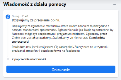 Facebook nie podzielił jednak tego zdania. Uprzejmie podziękował za zgłoszenie, ale stwierdził, że wypowiedź nie narusza „Standardów społeczności”.