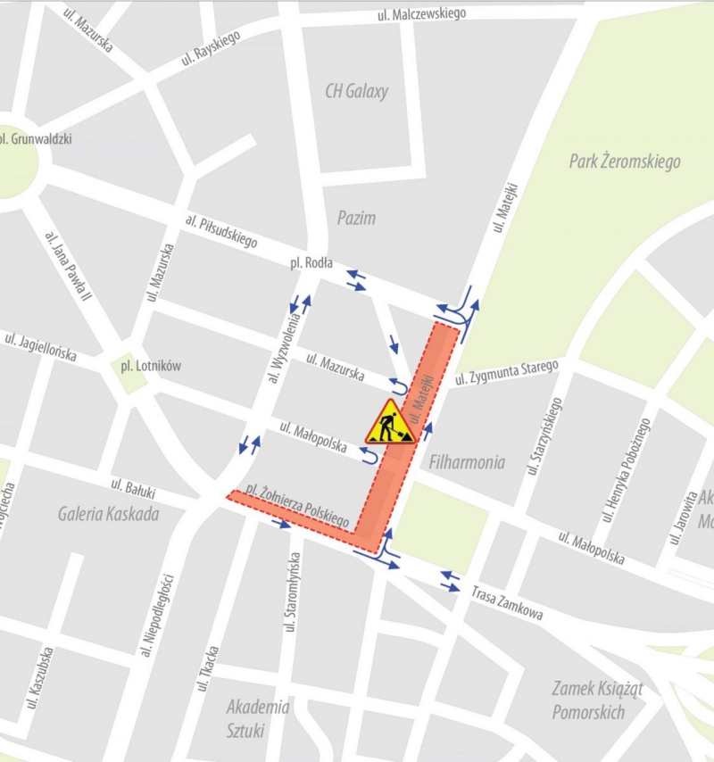 Kierowców czekają kolejne utrudnienia na ulicach Szczecina. W sobotę, 20 lutego wprowadzony zostanie kolejny etap czasowej organizacji ruchu związanej z przebudową torowisk. W ramach tego etapu w dalszym ciągu prace będą się odbywać na torowisku wzdłuż ulicy Matejki na odcinku od ulicy Piłsudskiego do placu Żołnierza Polskiego. Dodatkowo roboty rozpoczną się na odcinku wzdłuż placu Żołnierza Polskiego w części od ul. Matejki do al. Wyzwolenia. Roboty obejmą także jezdnię północną (w kierunku do al. Wyzwolenia).