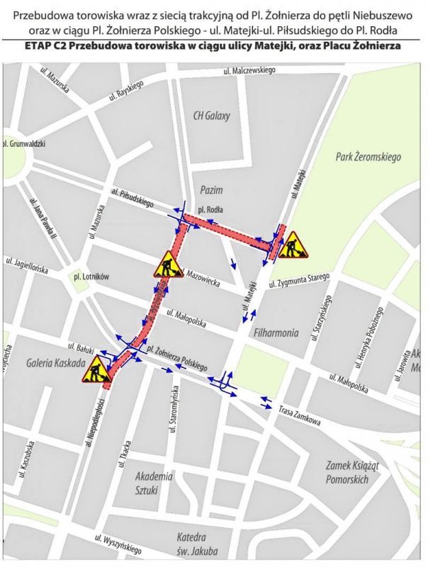 W dalszym wykonywane będą prace związane z przebudową układu drogowego i torowego na ulicy Matejki w rejonie skrzyżowania z ulicą Piłsudskiego, wzdłuż al. Niepodległości, al. Wyzwolenia od placu Żołnierza Polskiego do placu Rodła oraz ul. Piłsudskiego od placu Rodła do Matejki. W związku z tym wykonawca musi wprowadzić kolejne zmiany.