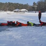 Różne techniki ratowania ludzi z zimnej wody pod którymi załamał się lód prezentowali we środę (10 lutego) przed południem policjanci i ratownicy Wodnego Ochotniczego Pogotowia Ratunkowego w Szczecinie. Policjanci oraz ratownicy z WOPR na jeziorze Głębokie pokazywali, co zrobić, gdy widzimy człowieka pod którym załamał się, bądź może załamać się lód.