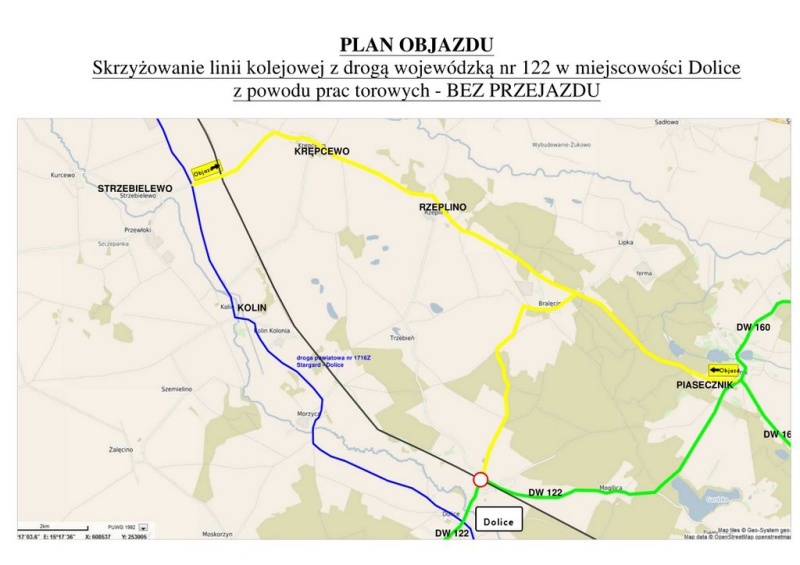 W związku z przebudową przejazdu kolejowego, oraz skrzyżowania drogi wojewódzkiej z drogą powiatową przejazd kolejowy w Dolicach zostanie zamknięty, Zamknięcie nastąpi od 20. stycznia do 5. lutego. Przez ten czas obowiązywać będzie objazd drogami powiatowymi przez Strzebielewo, Krępcewo do Piasecznika.